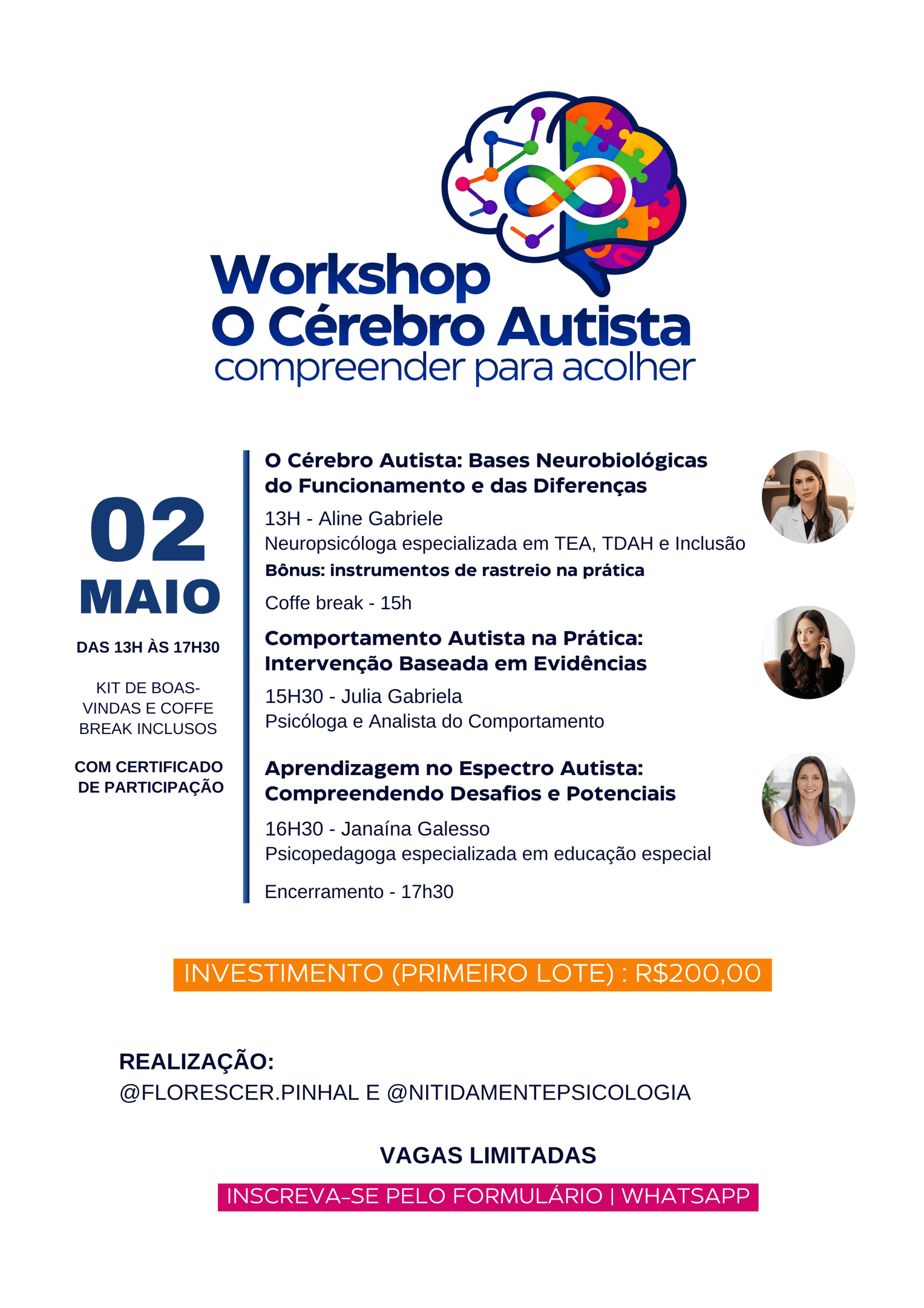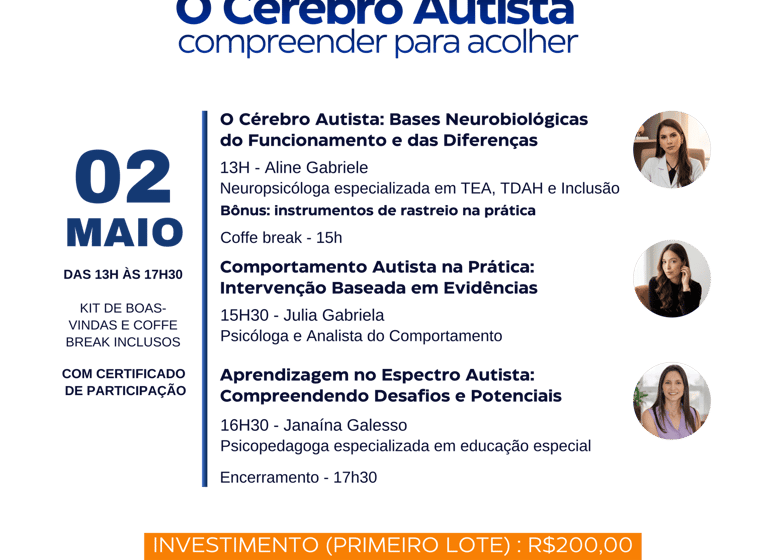Um encontro pensado para profissionais e estudantes que desejam aprofundar seus conhecimentos sobre o autismo de forma integrada, unindo ciência, prática clínica e estratégias aplicáveis no dia a dia.